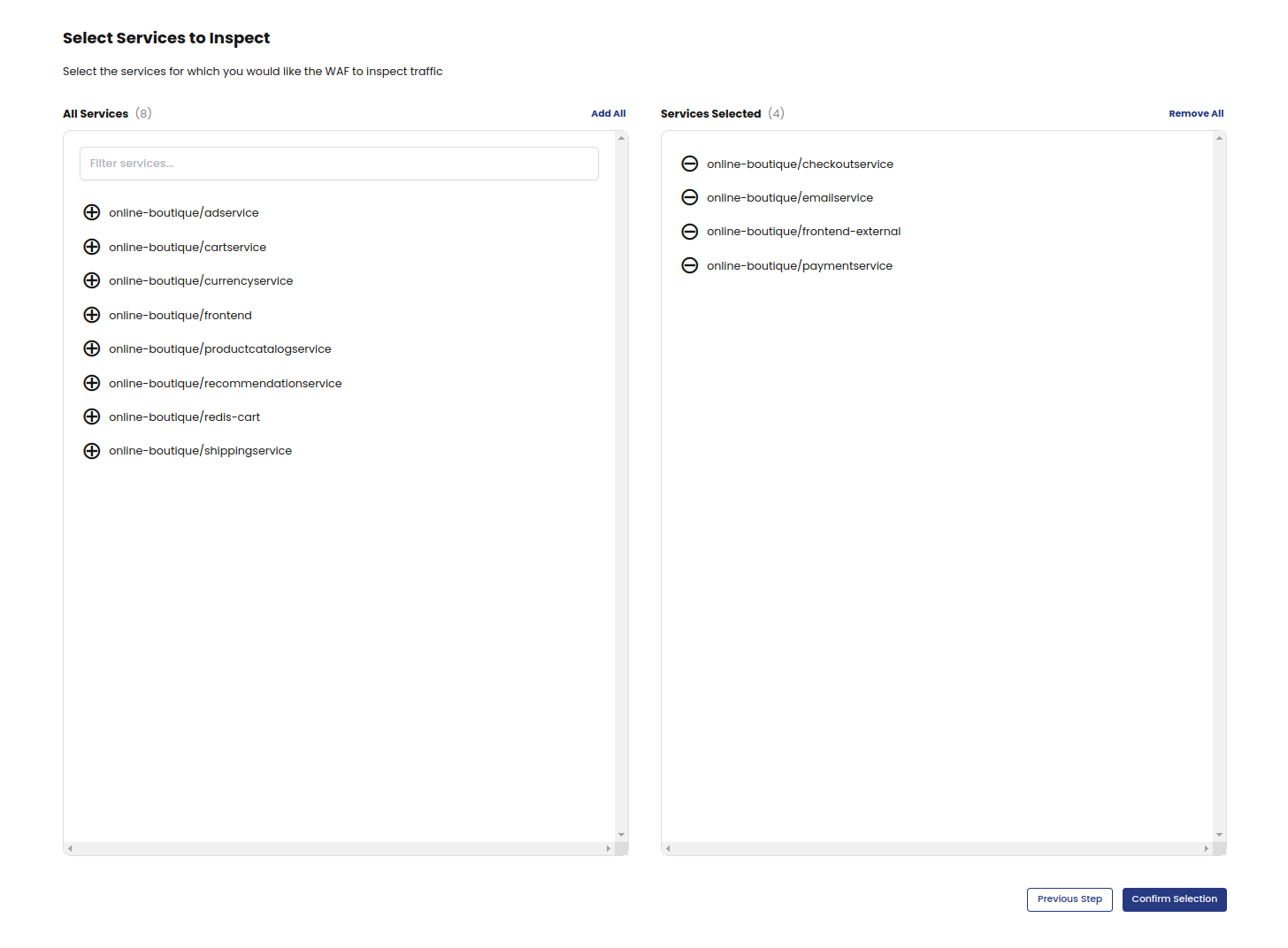 2. Select the deployments you want WAF to inspect, and then click Confirm Selections.